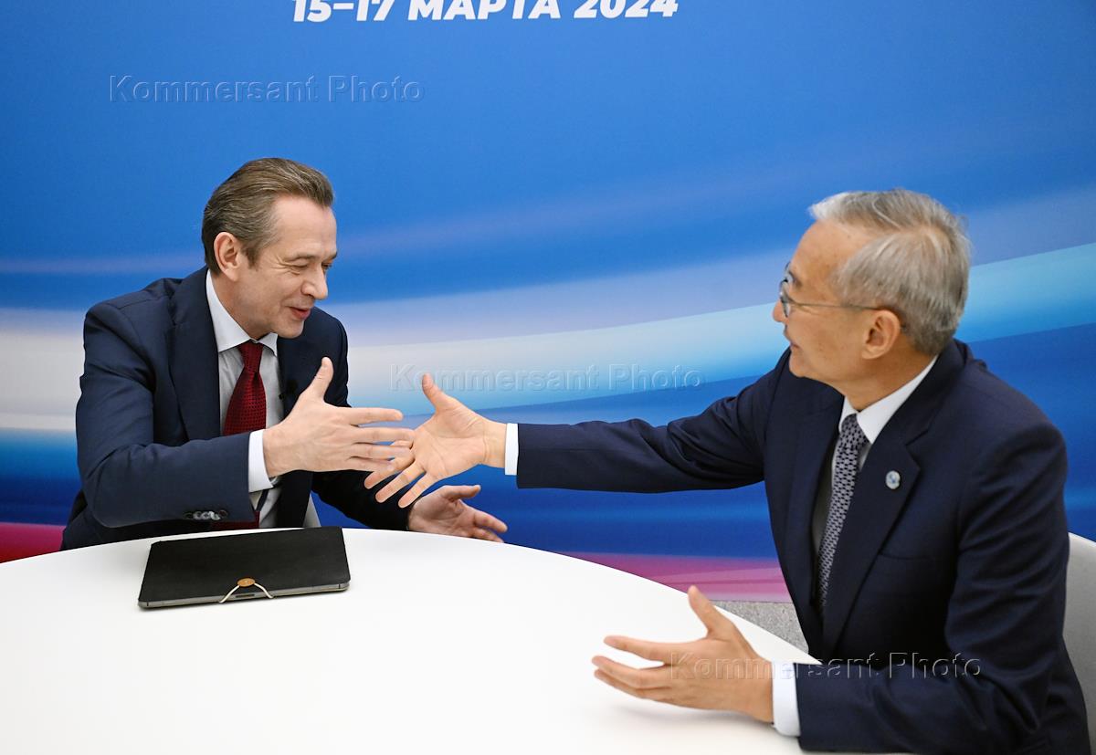 Russian presidential elections. Meeting with international observers of the Shanghai Cooperation Organization (SCO) at the central election headquarters of Russian presidential candidate and current Russian President Vladimir Putin in Gostiny Dvor. Co-chairman of the election headquarters of Russian presidential candidate Vladimir Putin, chairman of the Union of Theater Workers of Russia, artistic director of the Moscow Oleg Tabakov Theater Vladimir Mashkov (left) and SCO Secretary General Zhang Ming (right) during the meeting.