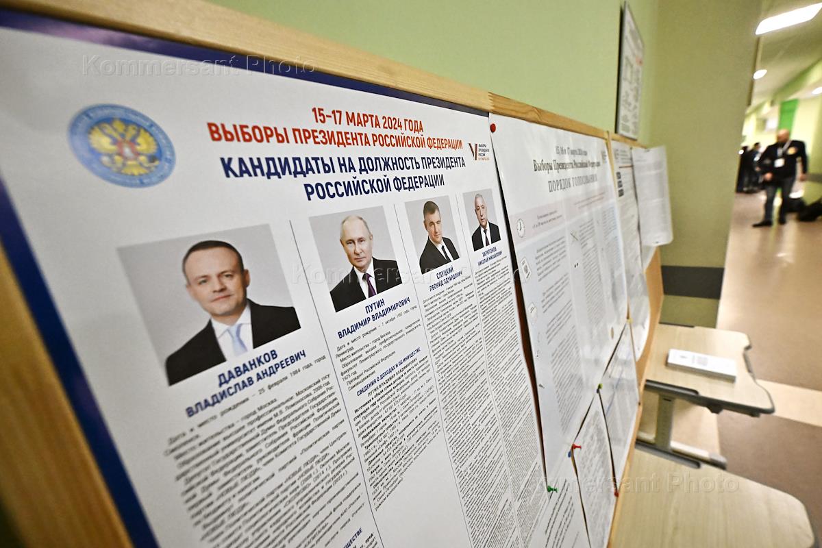 Выборы президента России. Жанровая фотография. Плакат с кандидатами на пост президента России на избирательном участке № 73 в школе № 1520 имени Капцовых.
