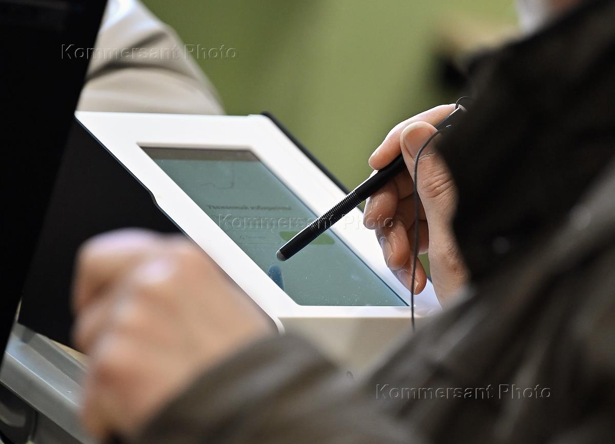 Выборы президента России. Жанровая фотография. Бюллетень для голосование опускается в урну на избирательном участке № 73 в школе № 1520 имени Капцовых.