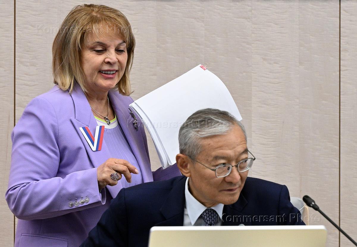 Russian presidential elections. Work of the information center of the Central Election Commission (CEC) of Russia. Chairman of the Central Election Commission of Russia Ella Pamfilova (left) and head of the CIS Observer Mission Ilkhom Nematov (right) at the information center.