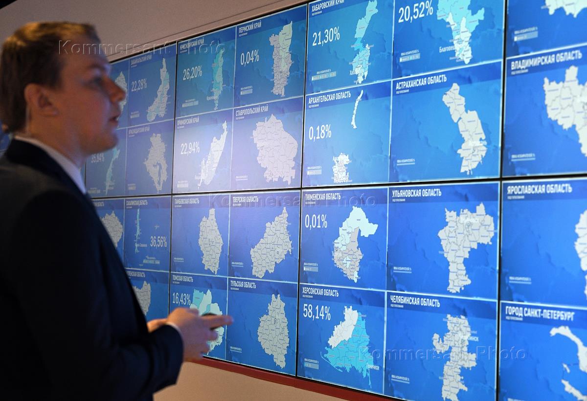 Russian presidential elections. Work of the information center of the Central Election Commission (CEC) of Russia. Genre photography. Screen depicting regions of Russia.