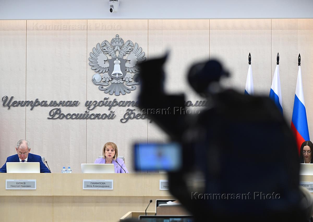 Выборы президента России. Работа информационного центра Центральной избирательной комиссии (ЦИК) России. Слева направо: заместитель председателя ЦИК России Николай Булаев, председатель ЦИК России Элла Памфилова и член ЦИК России Павел Андреев в информационном центре.
