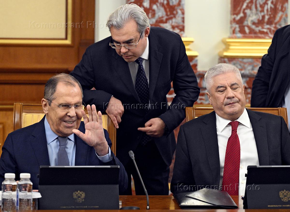Meeting of the Russian government. Russian Foreign Minister Sergei Lavrov (left) and Deputy Chief of Staff of the Russian Government Emil Tagirov (right) before the start of the meeting.