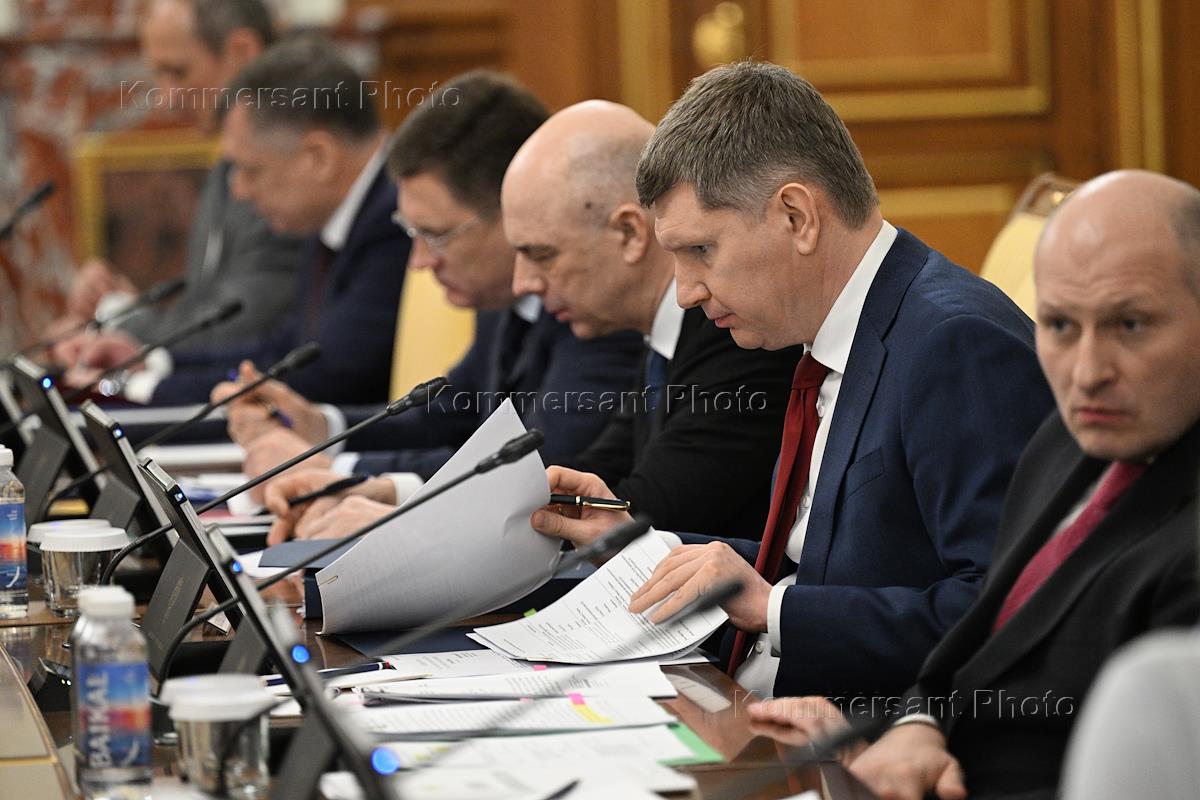 Meeting of the Russian government. Russian Finance Minister Anton Siluanov (center) and Russian Economic Development Minister Maxim Reshetnikov (second from right) before the start of the meeting.