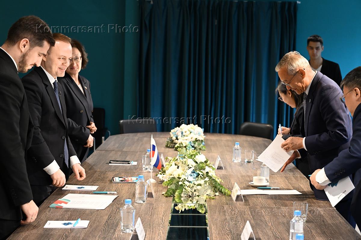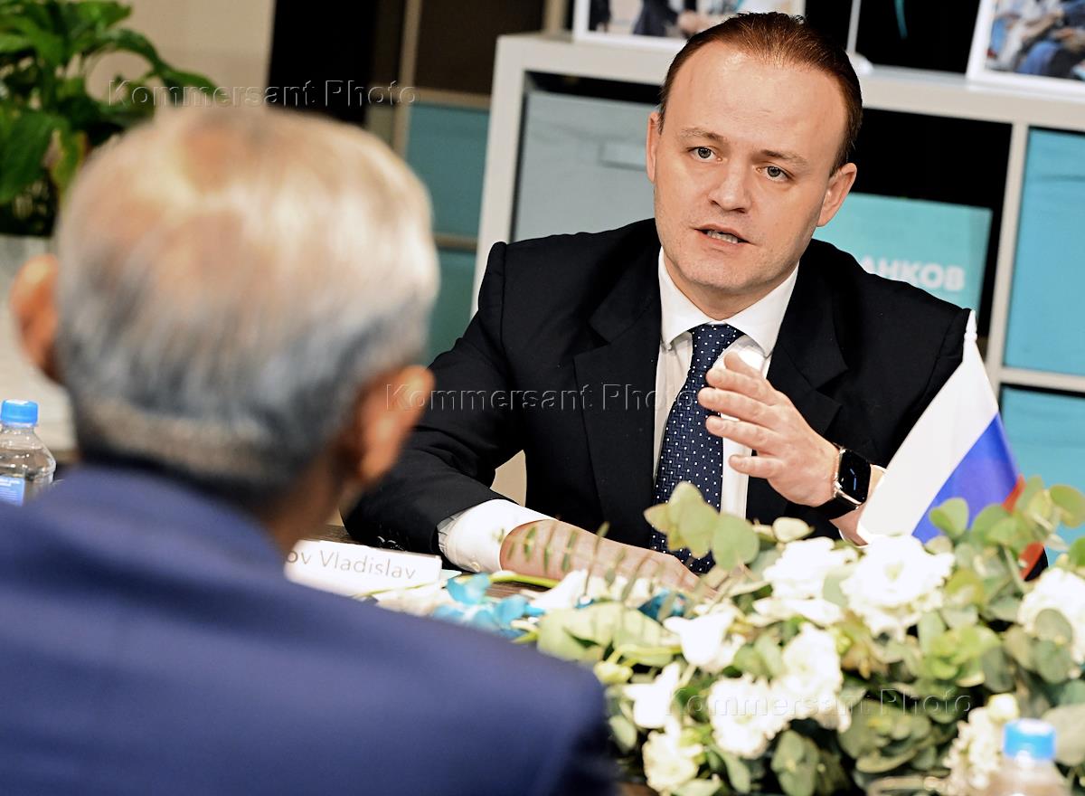 Кандидат в президенты России от партии "Новые люди", заместитель председателя Государственной думы России Владислав Даванков (справа) перед началом встречи с генеральным секретарем Шанхайской организации сотрудничества (ШОС) Чжаном Мином в штабе кандидата в президенты России Владислава Даванкова.