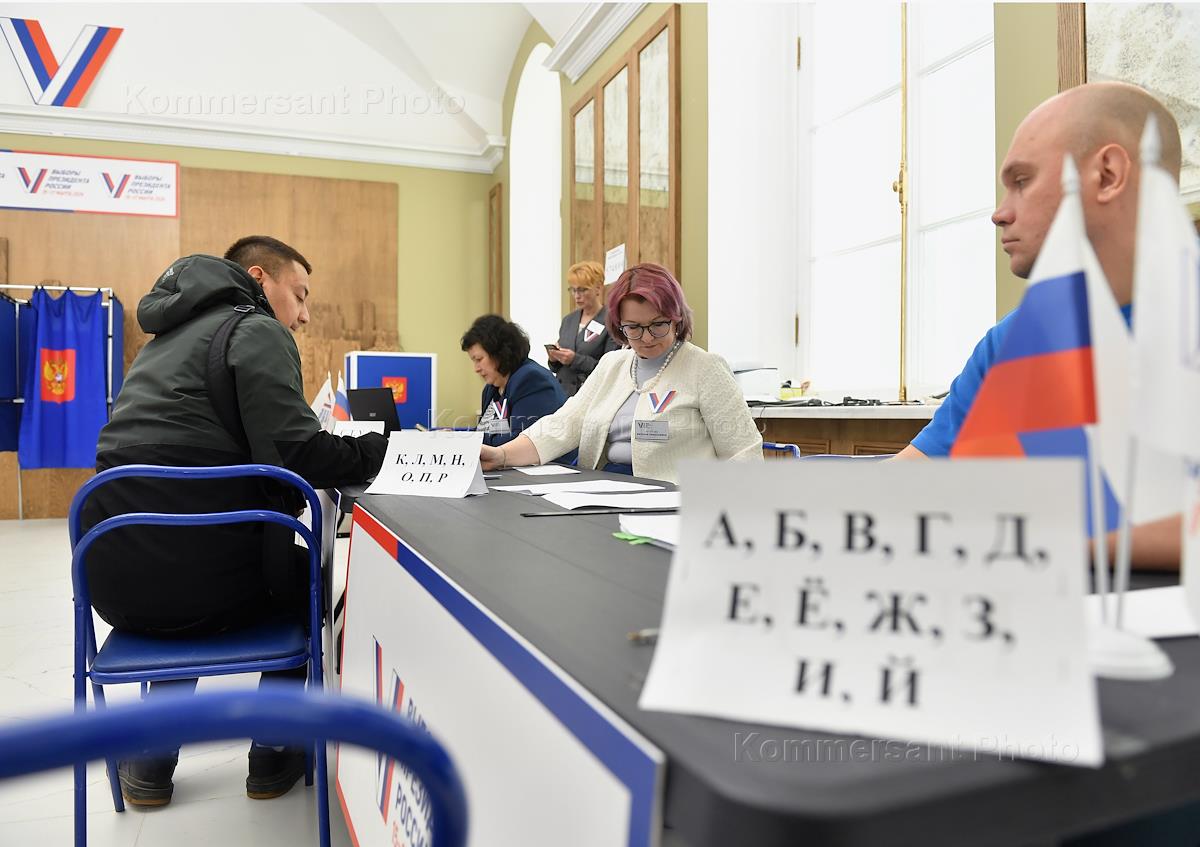 Russian presidential elections. Voters register before voting at a polling station at Moskovsky Station.