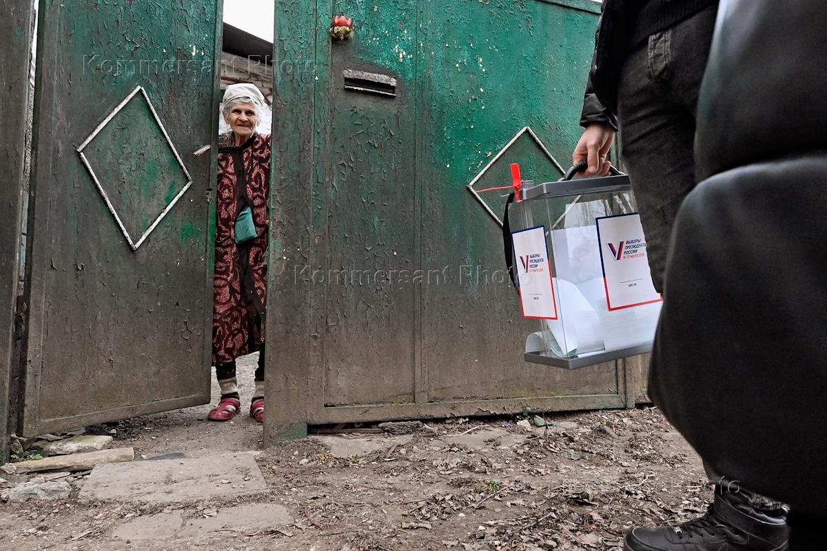 Выборы президента России в Луганской Народной Республике. Члены участковой избирательной комиссии с передвижной урной для голосования на дому.