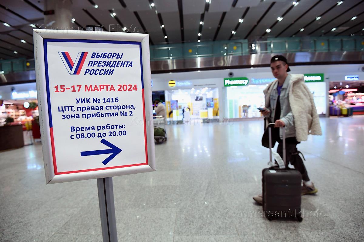 Выборы президента России. Голосование на временном избирательном участке в международном аэропорту Пулково имени Ф.М. Достоевского. Указатель избирательного участка.