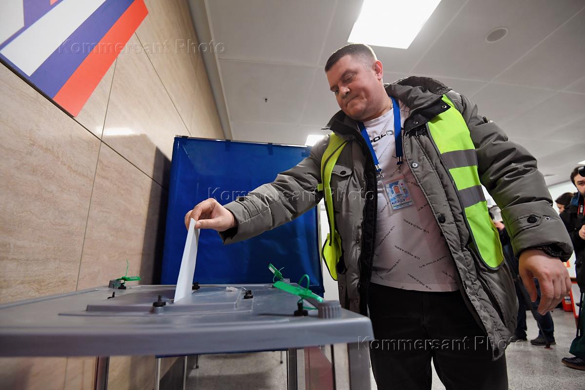 Выборы президента России. Голосование на временном избирательном участке в международном аэропорту Пулково имени Ф.М. Достоевского. Избиратель во время голосования.