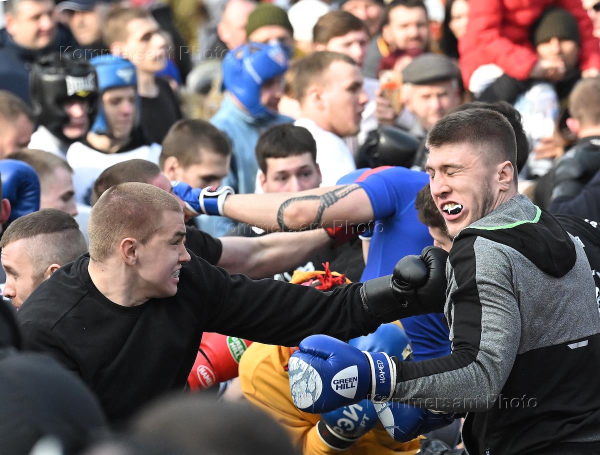 Празднование Широкой Масленицы в культурно-развлекательном комплексе "Кремль в Измайлово". Жанровая фотография. Участники традиционного кулачного боя "Стенка на стенку".