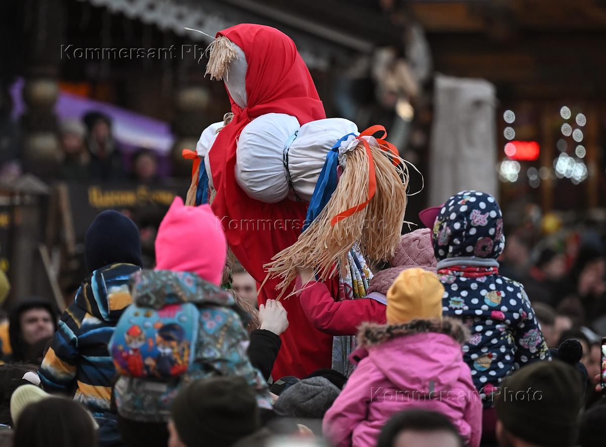 Celebration of Wide Maslenitsa in the cultural and entertainment complex "Kremlin in Izmailovo". Genre photography. Ritual of burning an effigy of Maslenitsa.