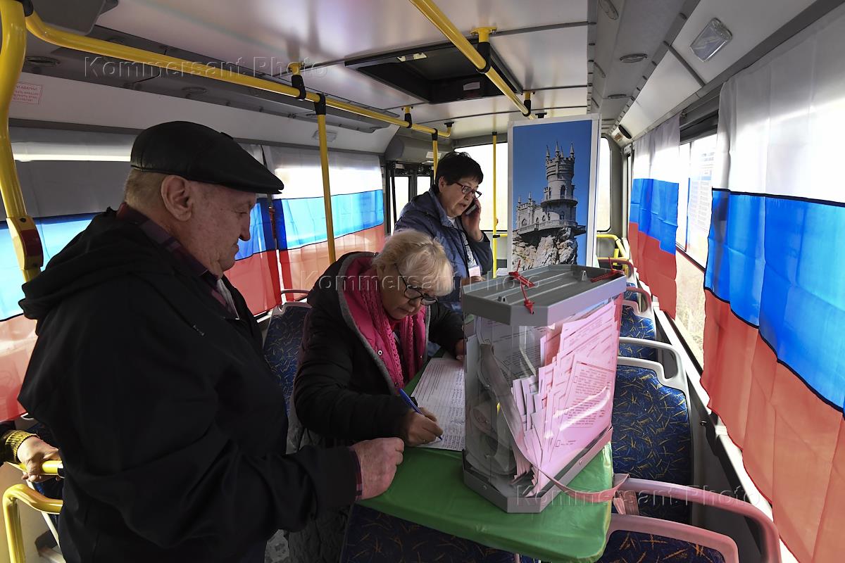 Russian presidential elections. Voters during voting at a mobile polling station on a bus.