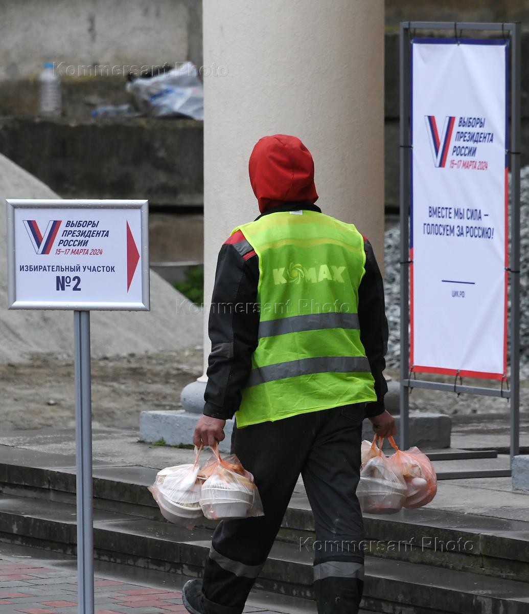 Russian presidential elections. Genre photography. A utility worker with bags of trash outside a polling station.