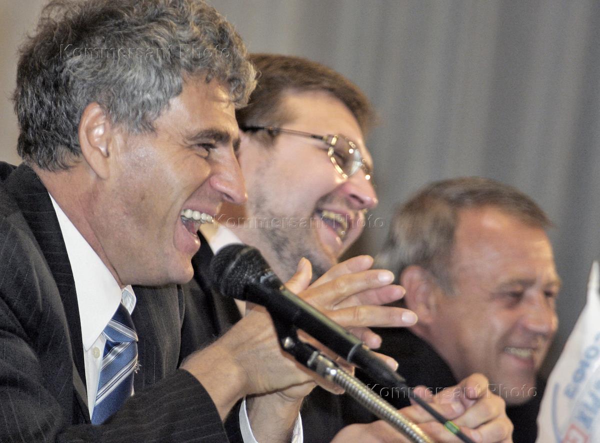 Председатель политсовета партии "Союз правых сил" (СПС) Никита Белых (в центре), руководитель креативного совета СПС, член правления РАО "ЕЭС" Леонид Гозман (слева) и член политсовета СПС Виктор Некрутенко (справа) во время заседания очередного съезда СПС. Съезд прошел в киноконцертном зале гостиничного комплекса "Измайлово".