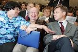 Лидер движения "Демократический союз" Валерия Новодворская (слева), президент Фонда поддержки законодательных инициатив Григорий Томчин (в центре) и член политсовета Республиканской партии России, член Комитета Государственной Думы России по делам Федерации и региональной политики Владимир Рыжков (справа) во время заседания очередного съезда партии "Союз правых сил" (СПС). Съезд прошел в киноконцертном зале гостиничного комплекса "Измайлово".