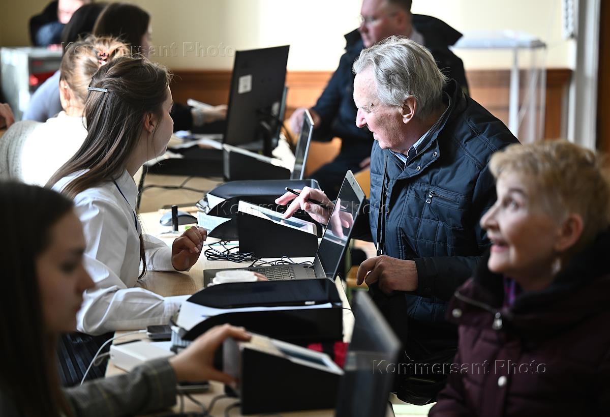 Выборы президента России. Регистрация избирателей перед голосованием на избирательном участке.