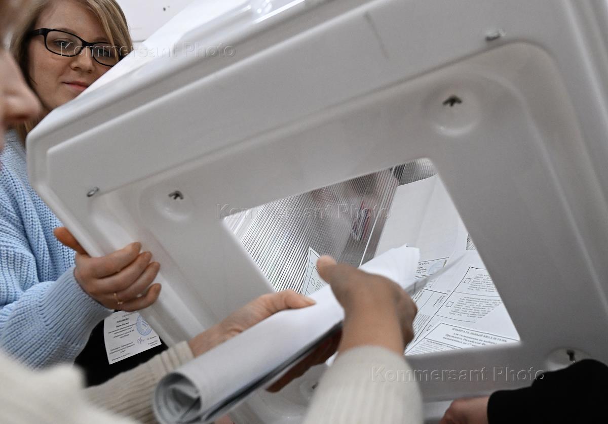 Russian presidential elections. Members of the precinct election commission of polling station No. 589 while packing ballots in a plastic bag for the subsequent counting of votes.