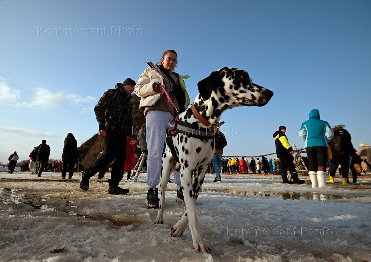Celebrating Maslenitsa in the Nikola-Lenivets art park. Genre photography. Participants of the holiday.