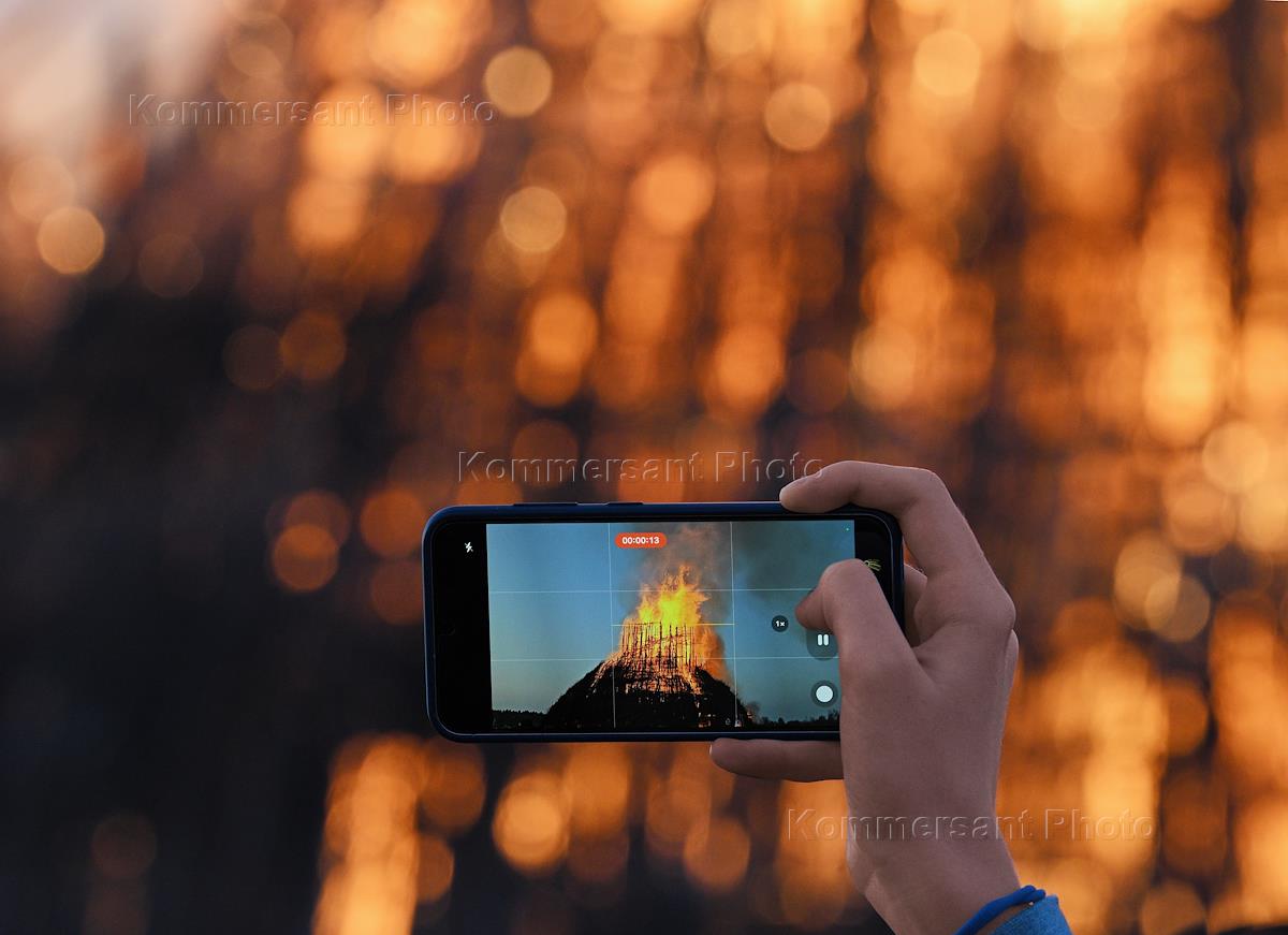 Celebrating Maslenitsa in the Nikola-Lenivets art park. Genre photography. A participant in the celebration films on his mobile phone the burning of an art object symbolizing winter.