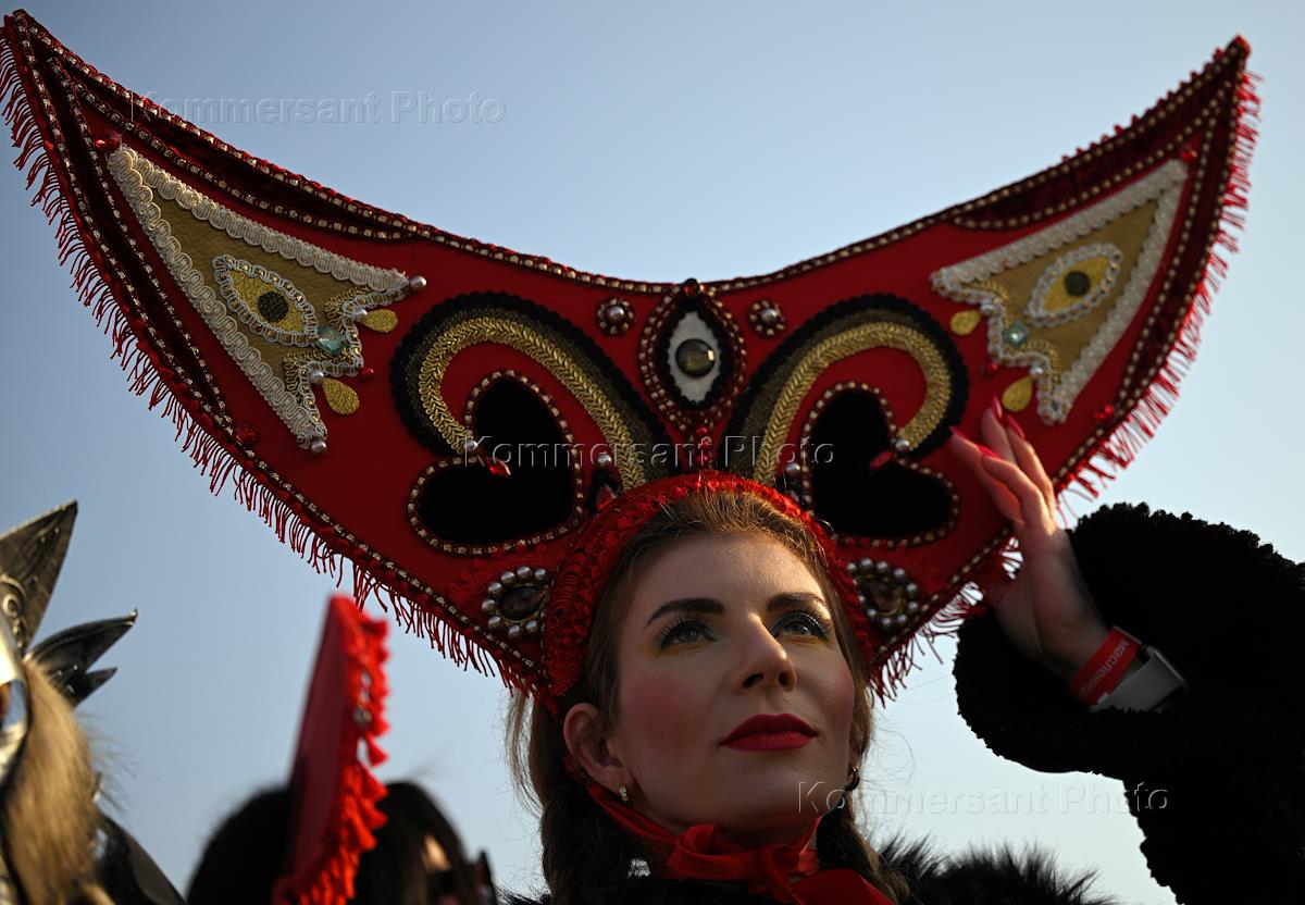 Celebrating Maslenitsa in the Nikola-Lenivets art park. Genre photography. A participant in the holiday wearing a kokoshnik on her head.
