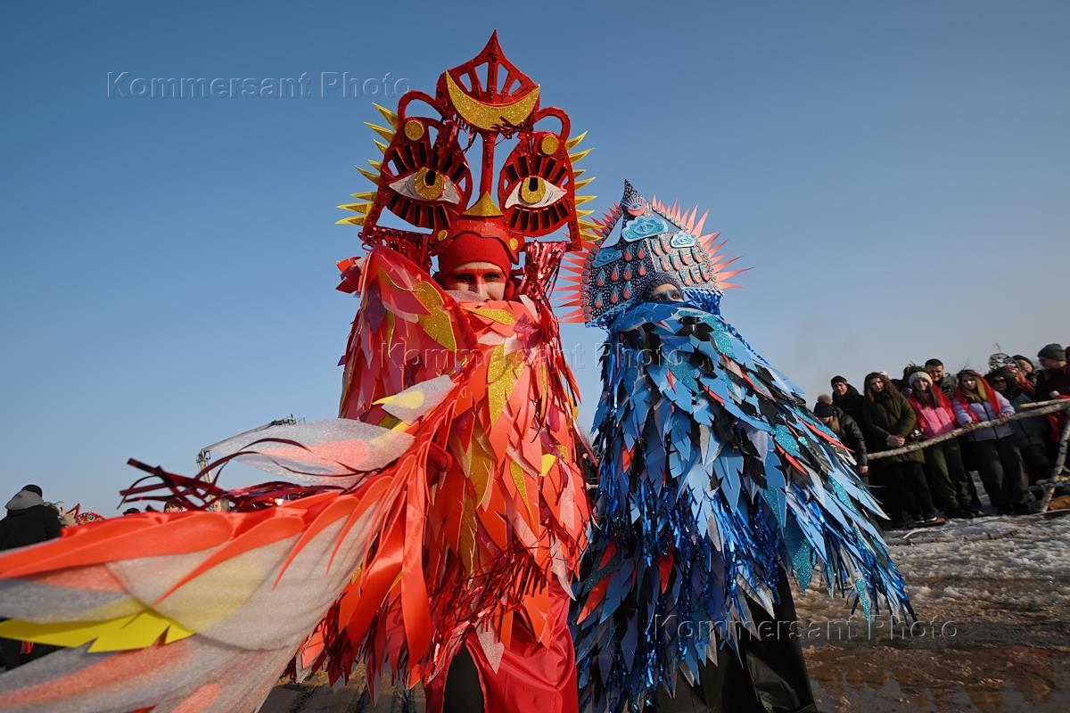 Celebrating Maslenitsa in the Nikola-Lenivets art park. Participants of the celebration.