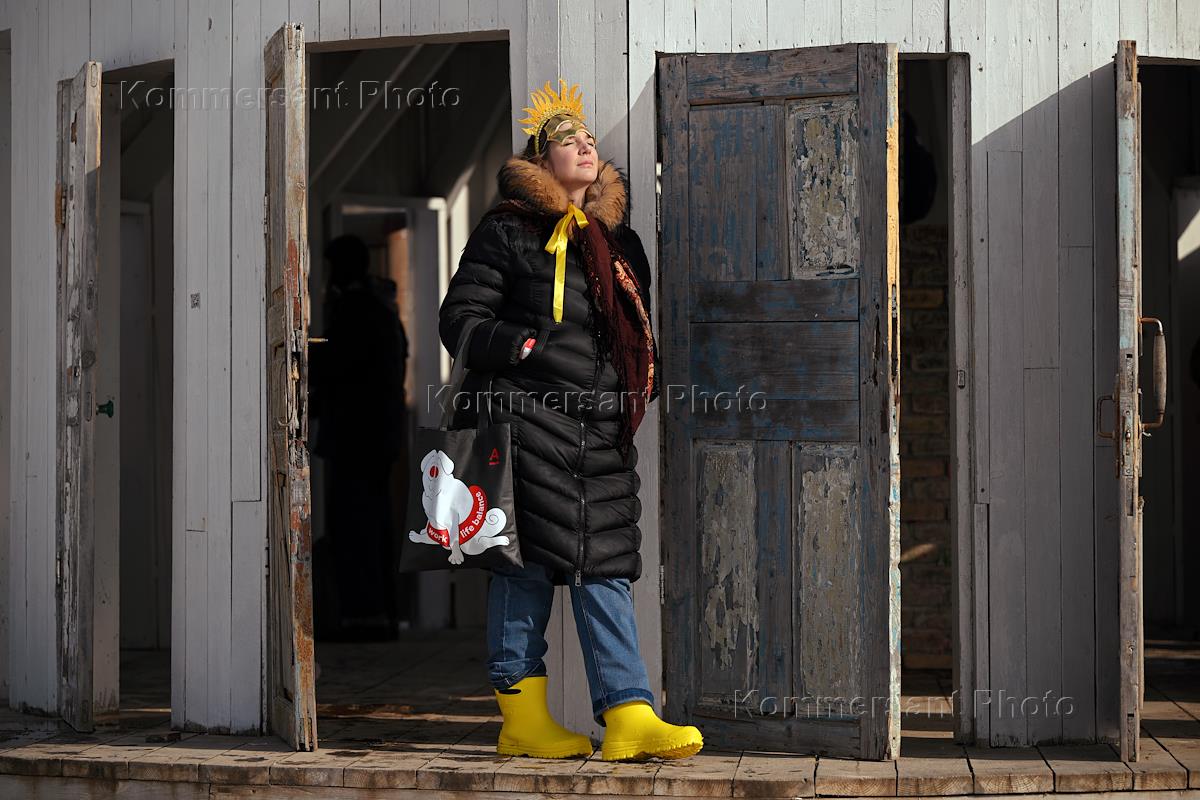 Celebrating Maslenitsa in the Nikola-Lenivets art park. Genre photography. Participant of the holiday.