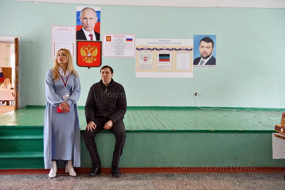 Выборы президента России в Донецкой Народной Республике (ДНР). Избирательный участок. Люди во время голосования.