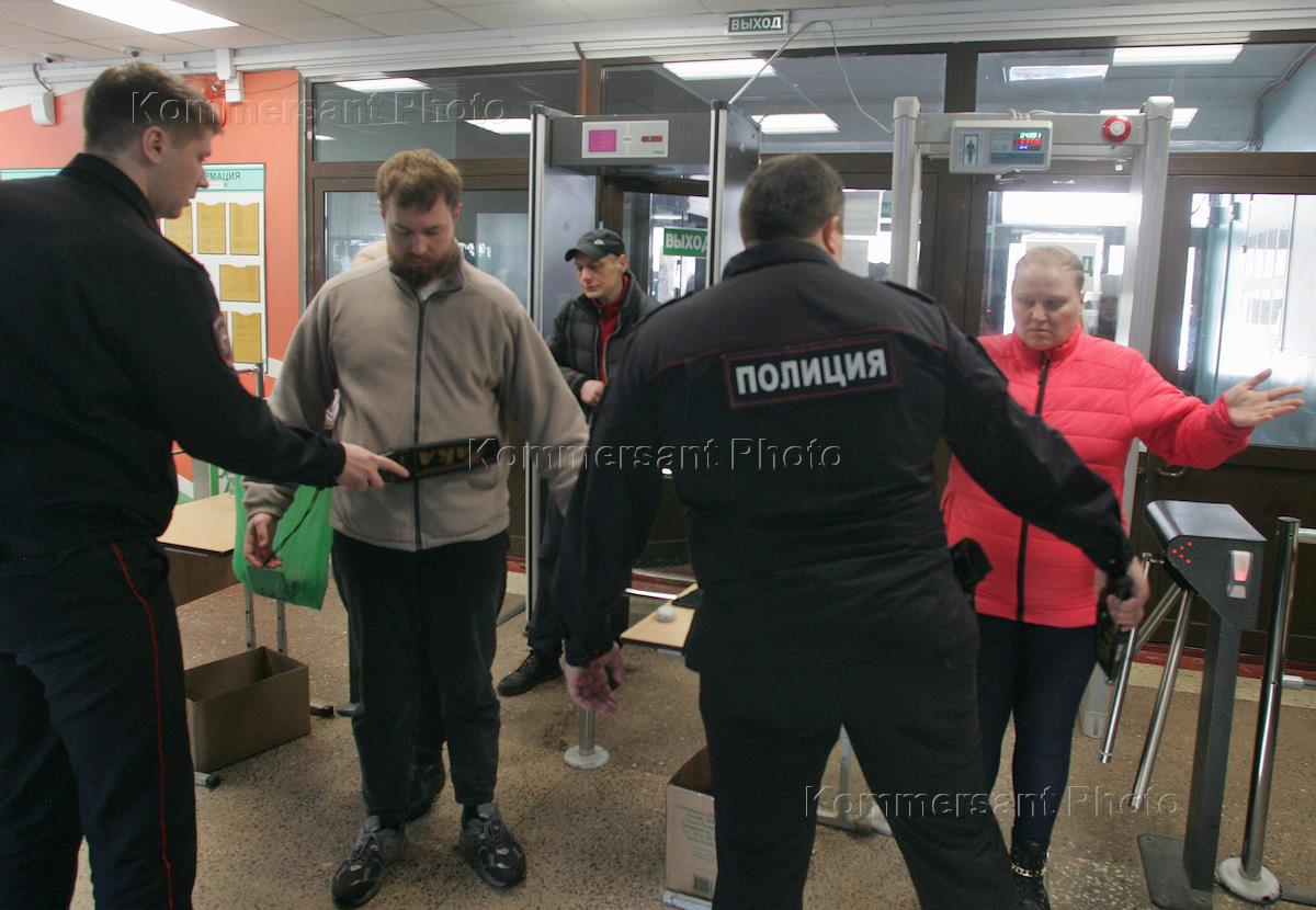 Russian presidential elections. Polling station in the gym of school No. 35. People being searched by police before voting.