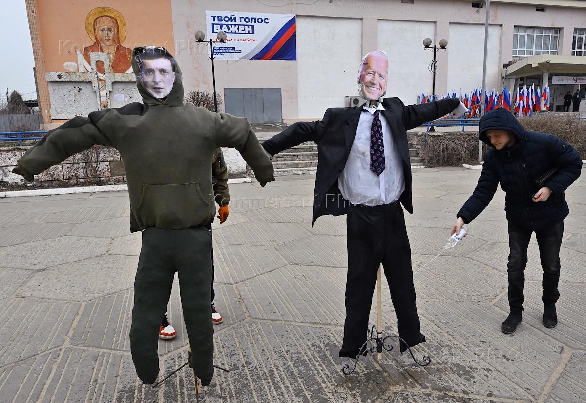 An action of burning effigies of Ukrainian President Vladimir Zelensky and US President Joe Biden in the Luganskaya village in the Lugansk People's Republic (LPR).