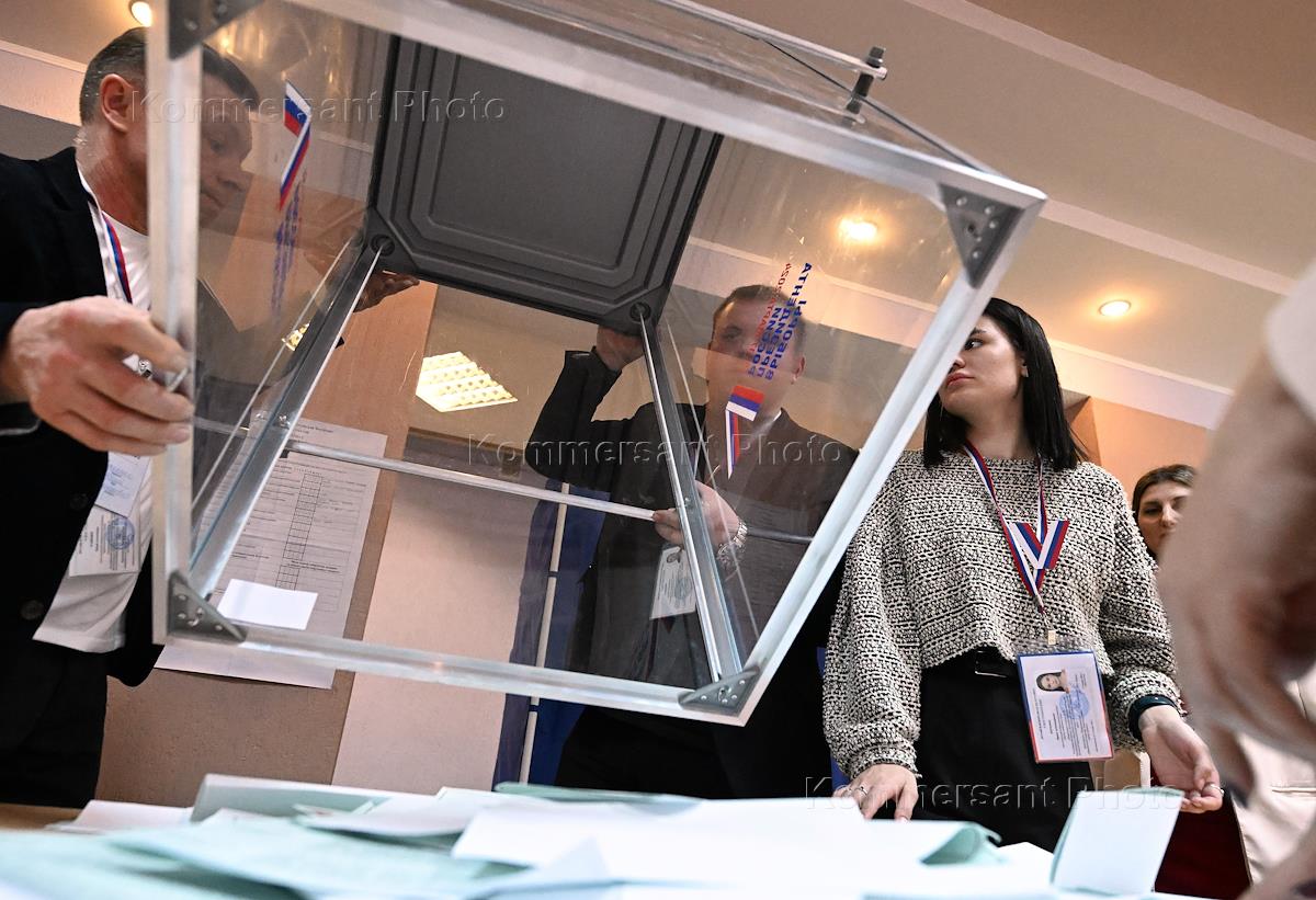 Выборы президента России в Луганской Народной Республике (ЛНР). Третий день голосования. Работа избирательного участка в Луганске. Подсчет голосов.