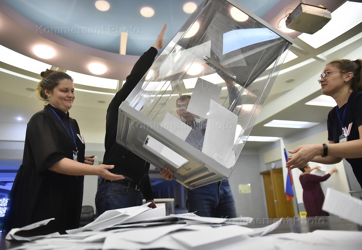Выборы президента России в Новосибирске. Третий день голосования. Работа избирательного участка. Сотрудники избирательной комиссии во время подсчета голосов.