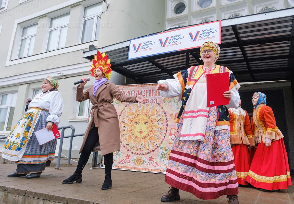 Выборы президента России и празднование Масленицы в Василеостровском районе. Выступление артистов перед участком для голосования.