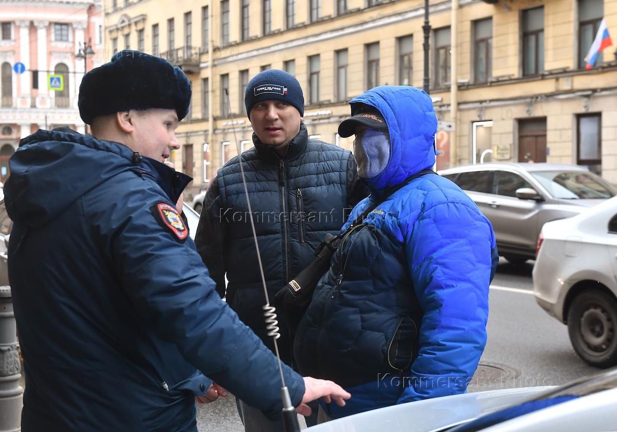 Russian presidential elections. The situation at polling station No. 2181 on Nevsky Prospekt. A police officer checks voters' documents at the entrance to the polling station.
