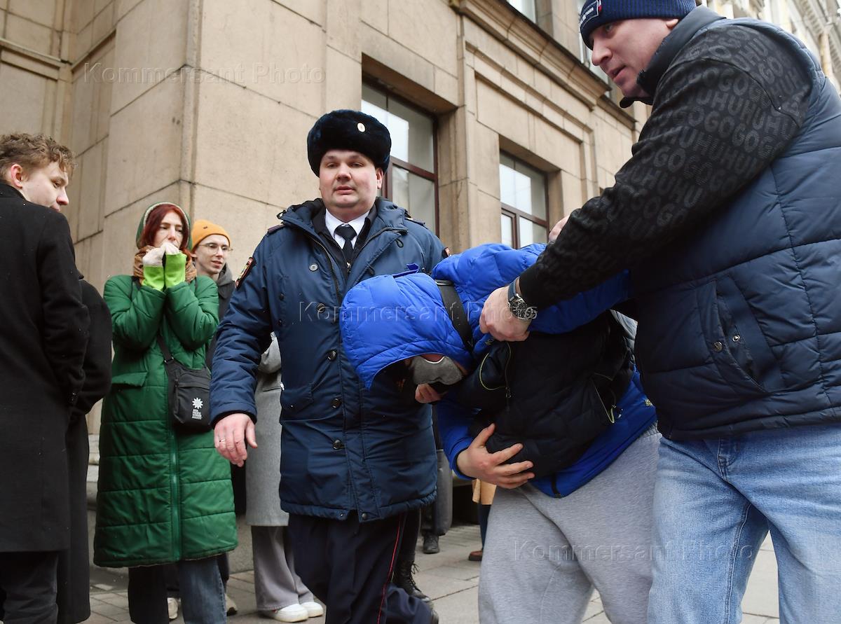 Russian presidential elections. The situation at polling station No. 2181 on Nevsky Prospekt. A police officer checks voters' documents at the entrance to the polling station.
