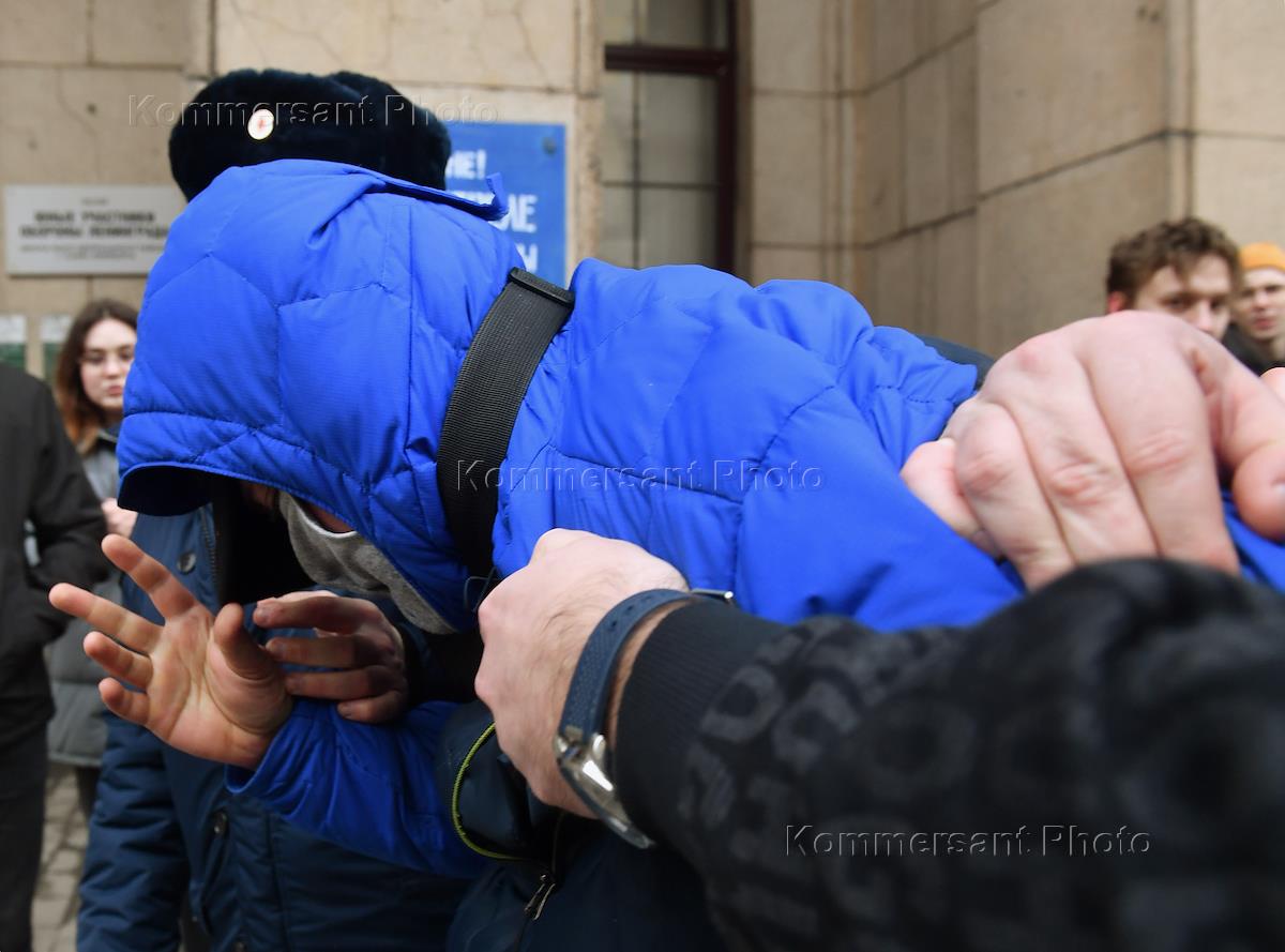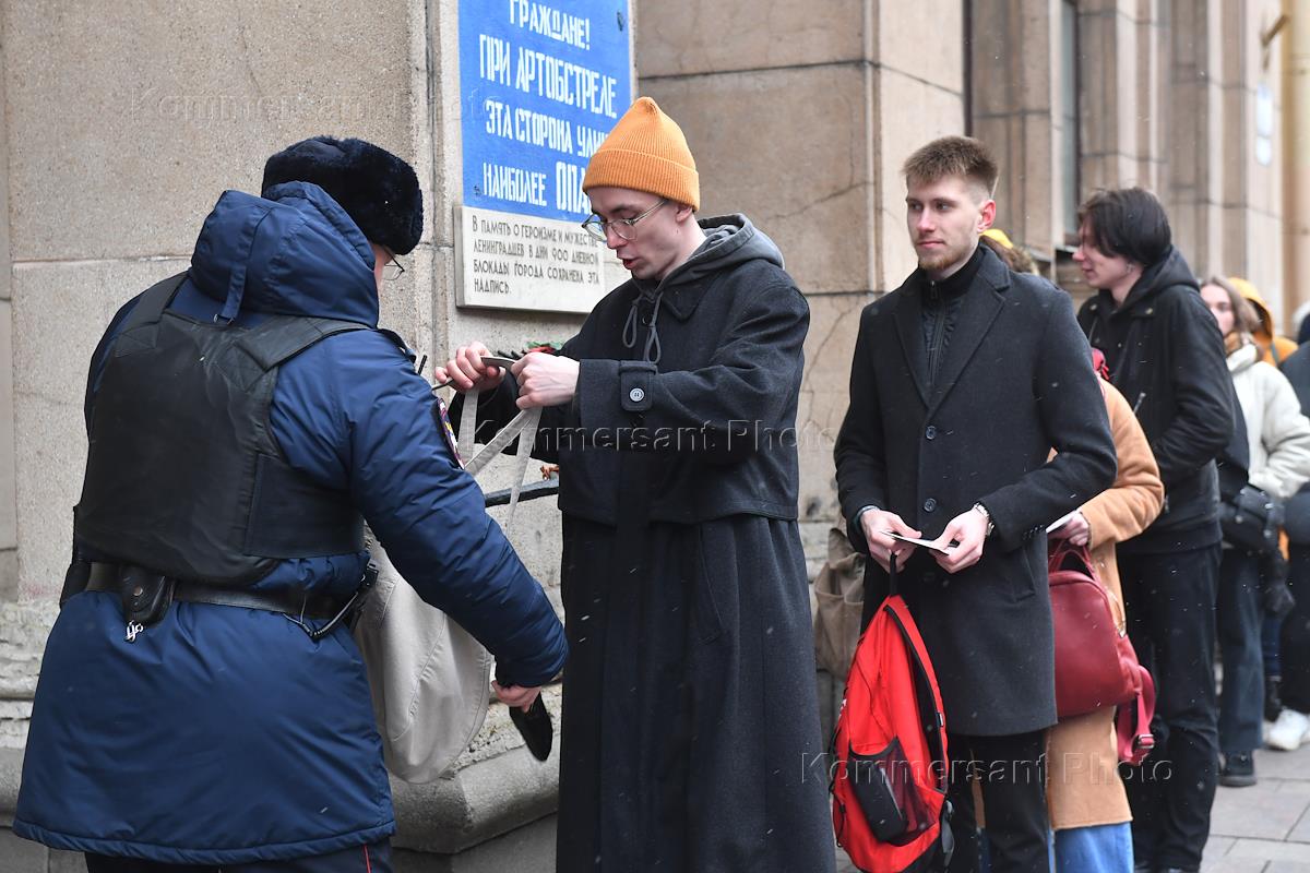 Выборы президента России. Ситуация у избирательного участка № 2181 на Невском проспекте. Сотрудник полиции во время проверки документов и личного досмотра избирателей при входе на участок.