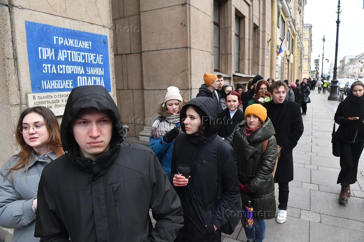Russian presidential elections. The situation at polling station No. 2181 on Nevsky Prospekt. A line of voters entering a polling station.
