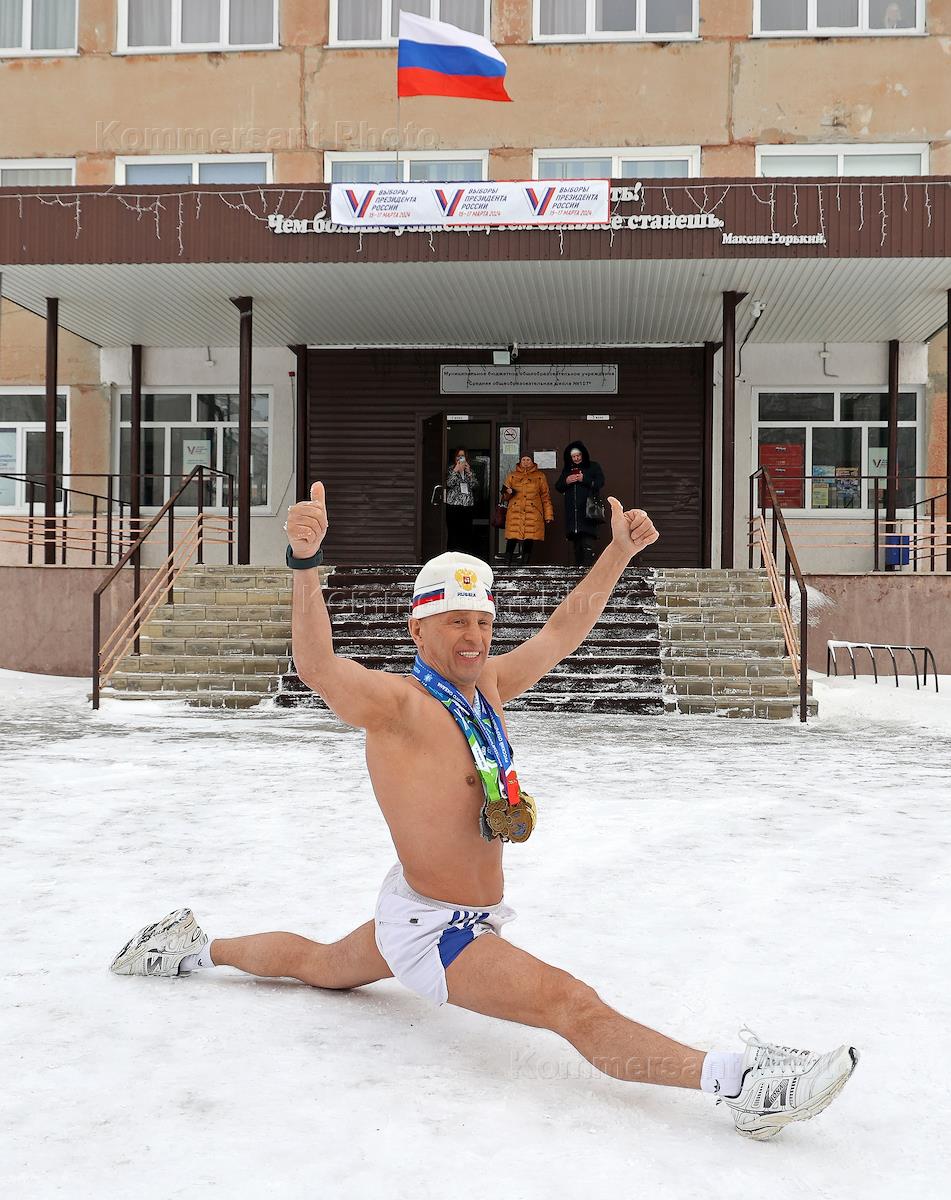Russian presidential elections in Barnaul. Polling station work. President of the Federation of Hardening and Sports Winter Swimming (Aquays-Sport) of the Altai Territory "Polar Bears" Alexander Zelenetsky after voting.