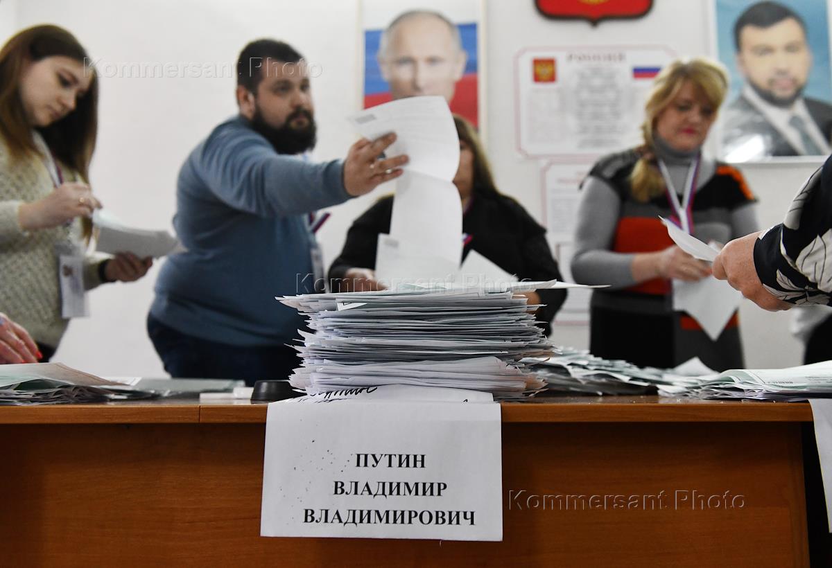 Russian presidential elections in the Donetsk People's Republic. Preliminary mobile voting in the Budennovsky district of Donetsk. Election officials during the vote count.