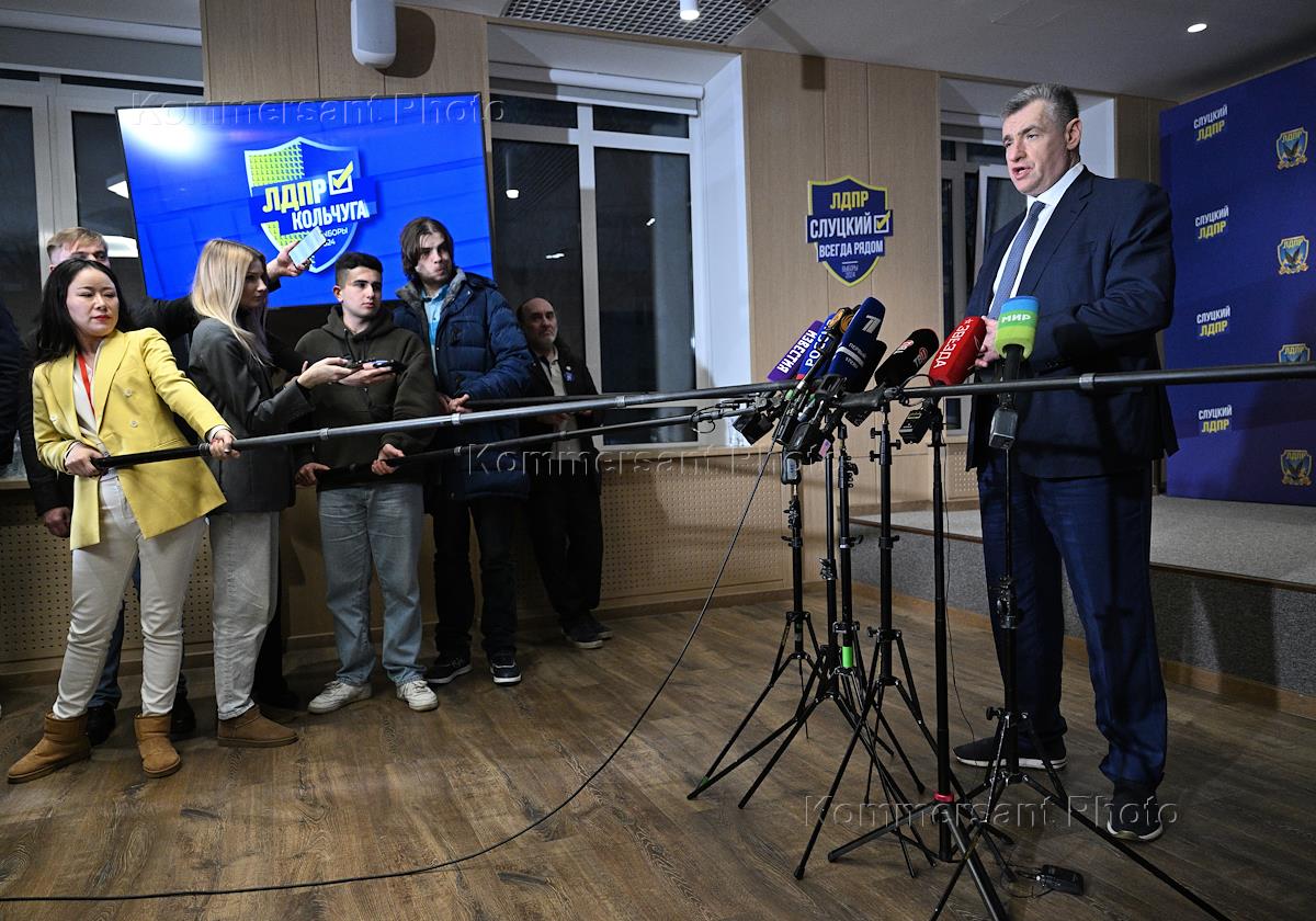 Выборы президента России. Презентация работы ситуационного центра по наблюдению за ходом голосования "ЛДПР. Кольчуга" в избирательном штабе кандидата на должность президента России от Либерально демократической парии России (ЛДПР), председателя ЛДПР Леонида Слуцкого. Кандидат на должность президента России от ЛДПР, председатель ЛДПР Леонид Слуцкий во время презентации.