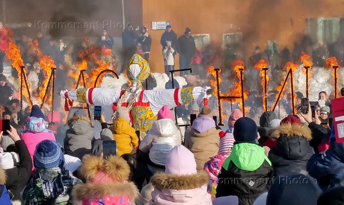 Celebration of Broad Maslenitsa. Farewell to winter in Preobrazhensky Park in the Academic District of Yekaterinburg. Genre photography.