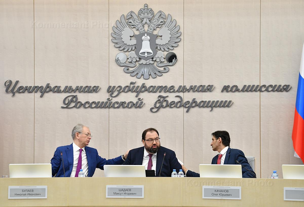 Russian presidential elections. Work of the Information Center of the Central Election Commission (CEC) of Russia. From left to right: Deputy Chairman of the Central Election Commission of Russia Nikolai Bulaev, Minister of Digital Development, Communications and Mass Communications of Russia Maksut Shadayev and Deputy Minister of Digital Development, Communications and Mass Communications of Russia, Chief Designer of the State Automated System "Elections" Oleg Kachanov during a briefing on the progress of voting in the presidential election Russia.