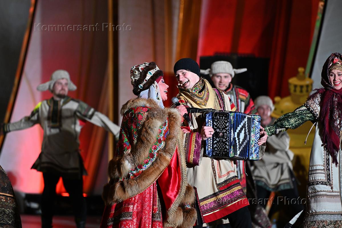 Musical and theatrical show celebrating Wide Maslenitsa on the main street stage of the exhibition-forum "Russia" at VDNH. Performance by artists during the show.