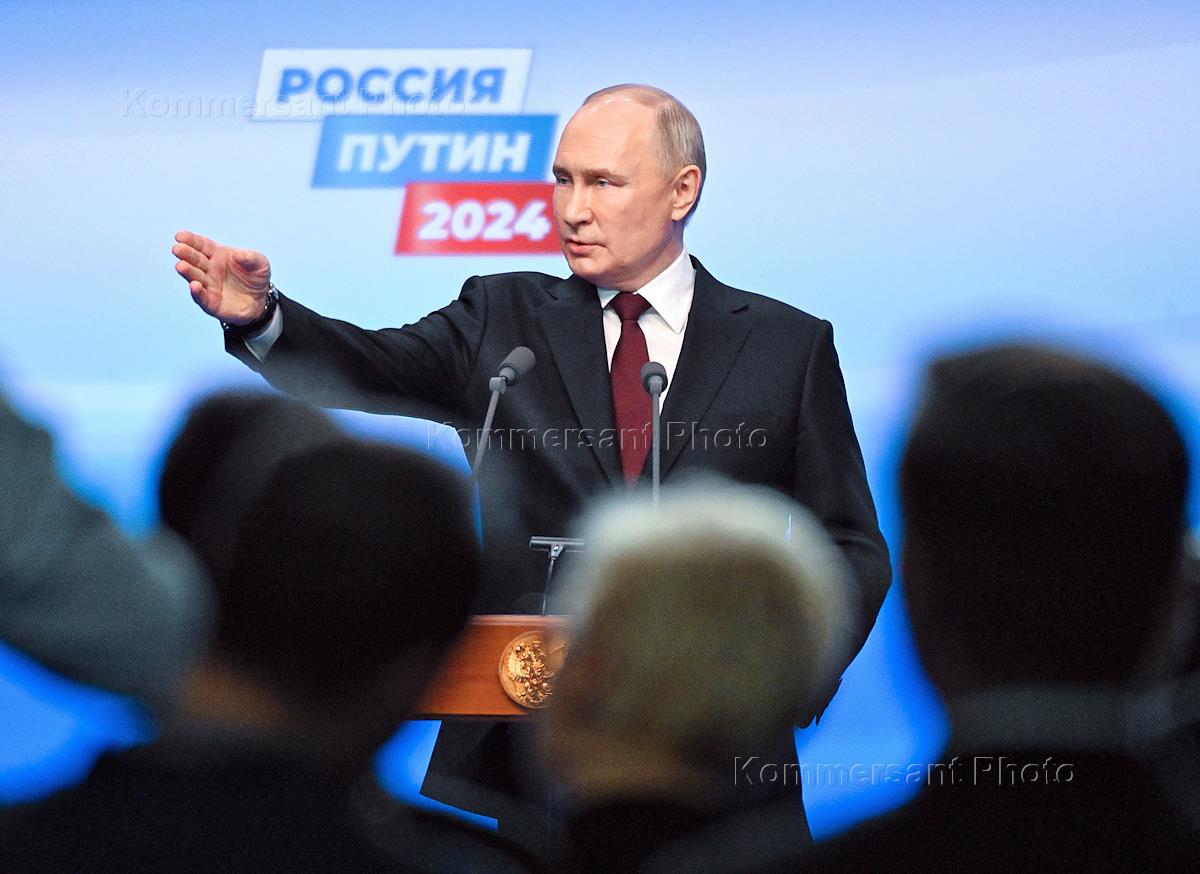 Russian presidential elections. The work of the pre-election headquarters of Russian presidential candidate Vladimir Putin in Gostiny Dvor. Russian presidential candidate and current Russian President Vladimir Putin speaks to reporters at his campaign headquarters.