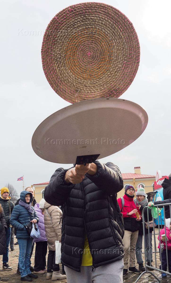 Celebration of Wide Maslenitsa. Festive festivities on the territory of the Peter and Paul Fortress. Genre photography.