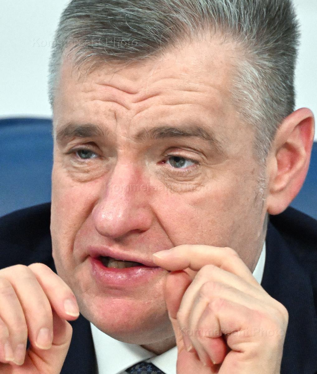 Пресс-конференция, посвященная подведению итогов участия кандидата от ЛДПР в президентских выборах 2024 года, в пресс-центре ТАСС. Председатель партии Либерально-демократическая партия России (ЛДПР), руководитель фракции ЛДПР в Государственной думе России Леонид Слуцкий во время пресс-конференции.