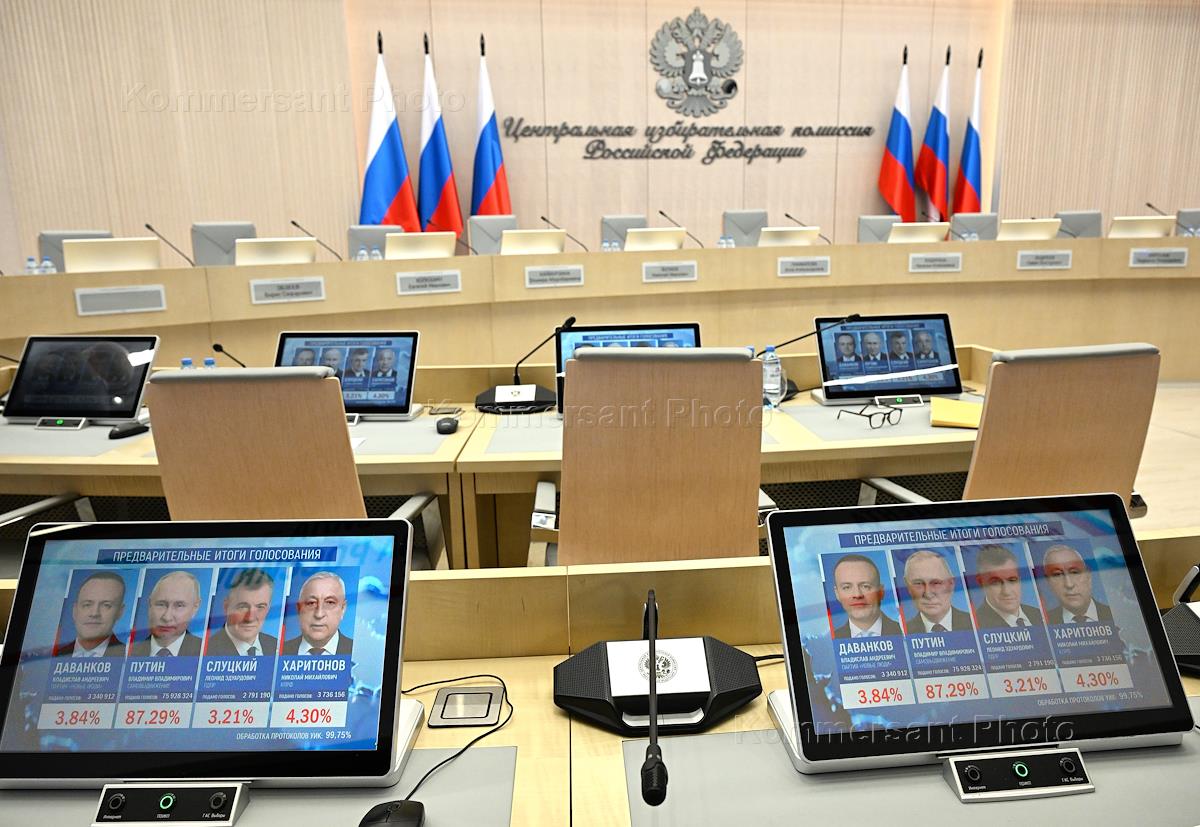 Russian presidential elections. Meeting of the Central Election Commission (CEC) of Russia at the information center.