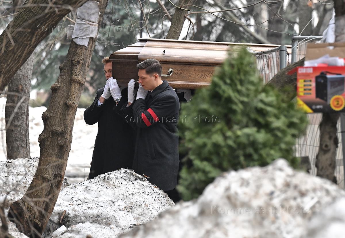 Farewell ceremony for the actor, director and president of the Moscow Academic Theater of Satire Alexander Shirvindt at the Moscow Academic Theater of Satire. Funeral service staff with a basket of flowers.