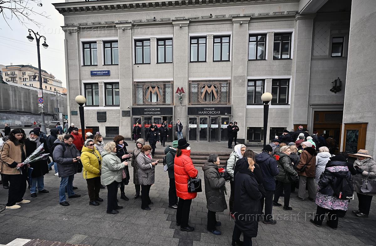 Церемония прощания с актером, режиссером и президентом Московского академического театра сатиры Александром Ширвиндтом в Московском Академическом Театре Сатиры. Люди стоят в очереди перед началом церемонии.