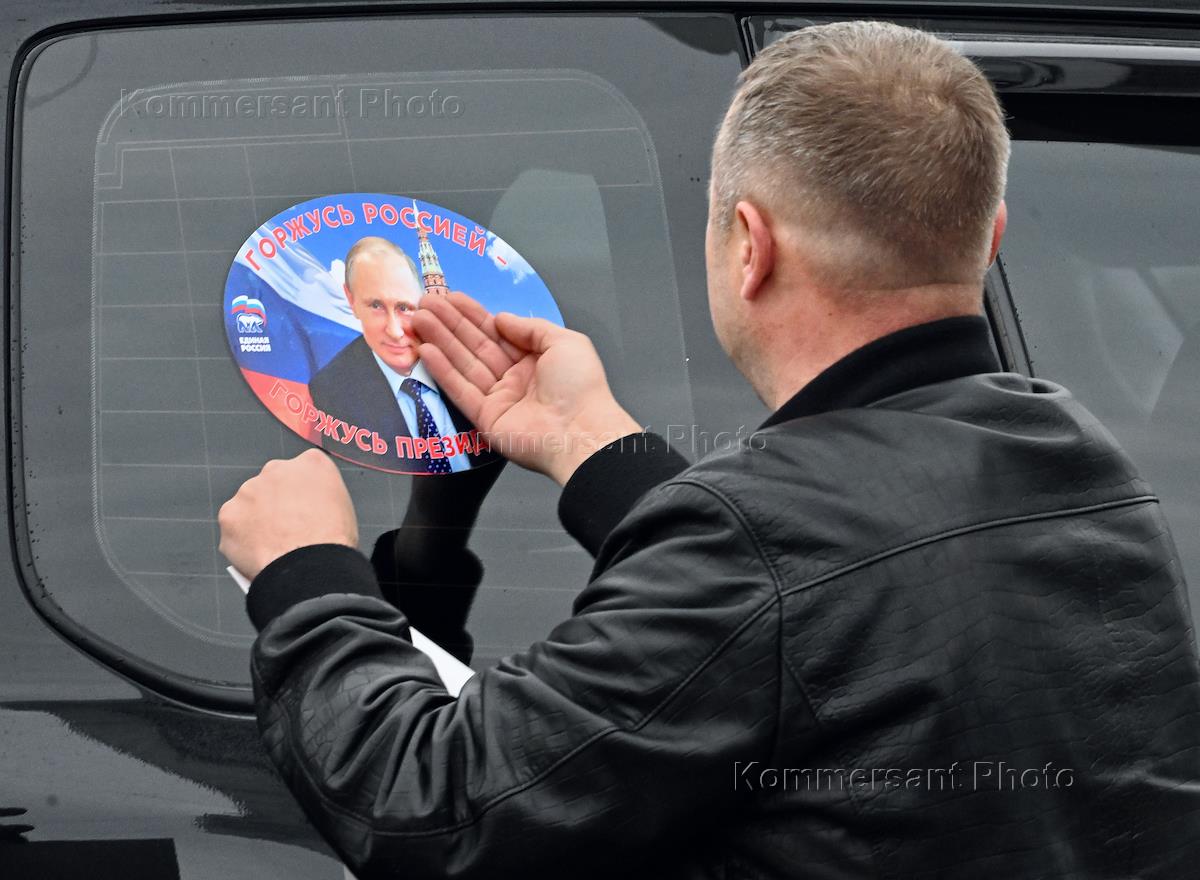 Автопробег "За Путина!", организованный региональным отделением партии "Единая Россия", в честь победы президента Владимира Путина на выборах президента России. Участники автопробега.