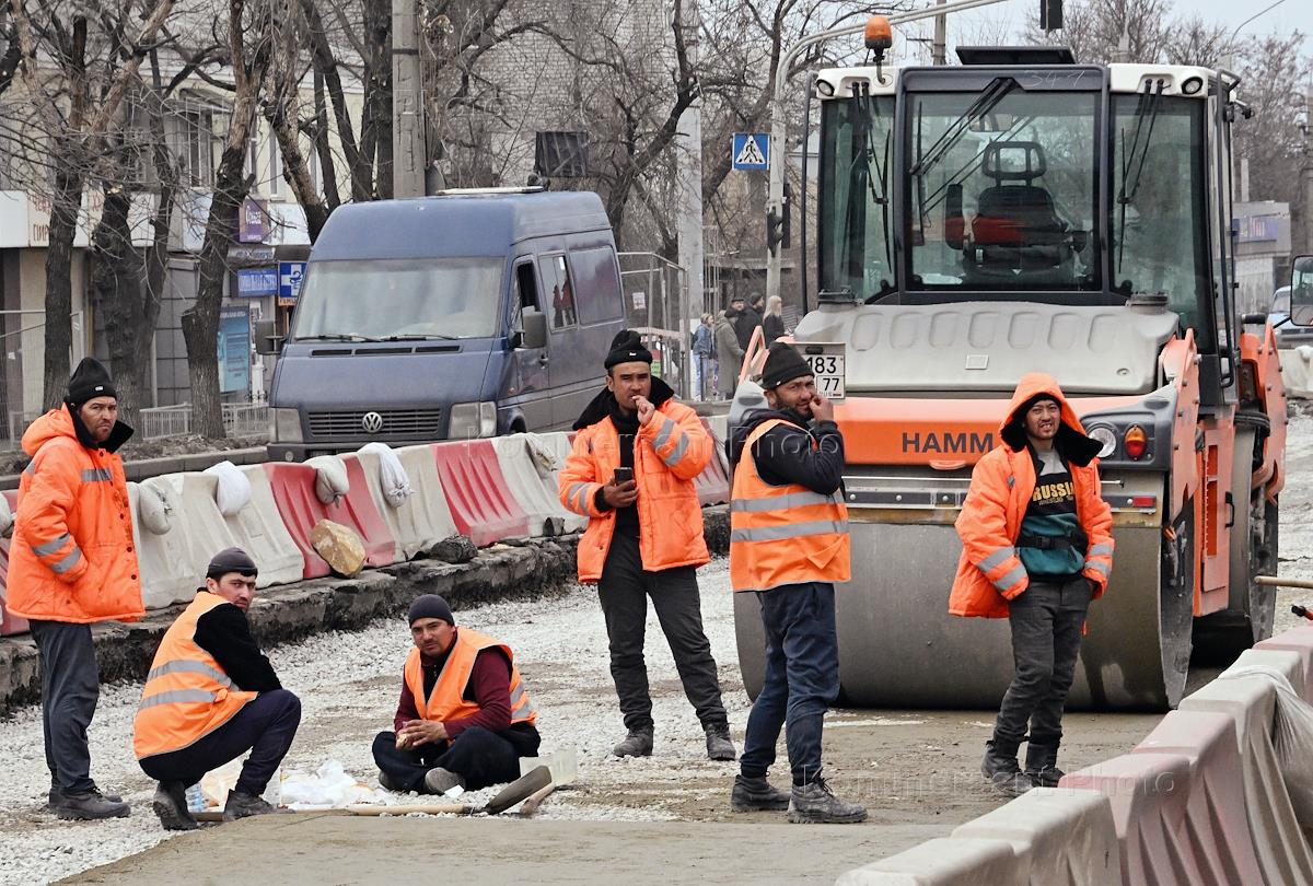 Автопробег "За Путина!", организованный региональным отделением партии "Единая Россия", в честь победы президента Владимира Путина на выборах президента России. Жанровая фотография. Сотрудники дорожной службы во время ремонта и укладки покрытия трассы.